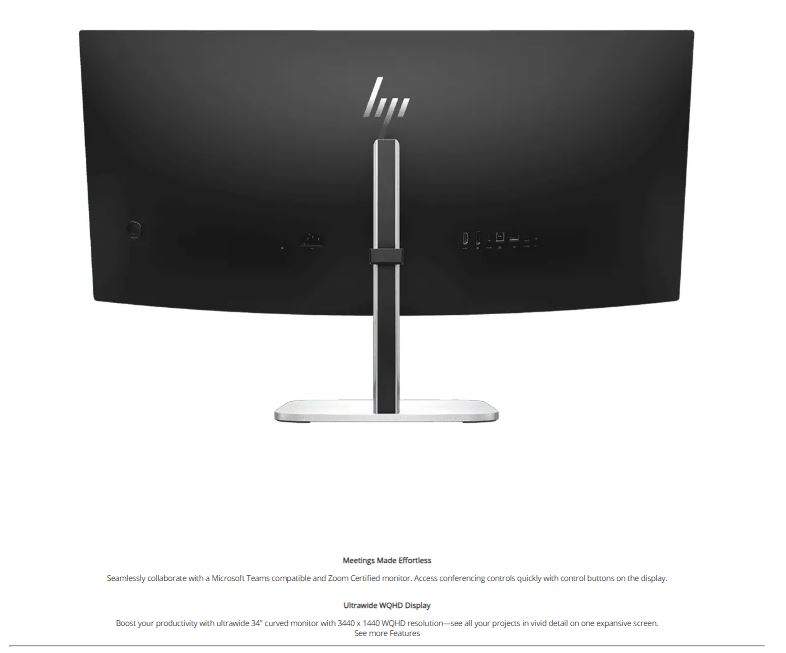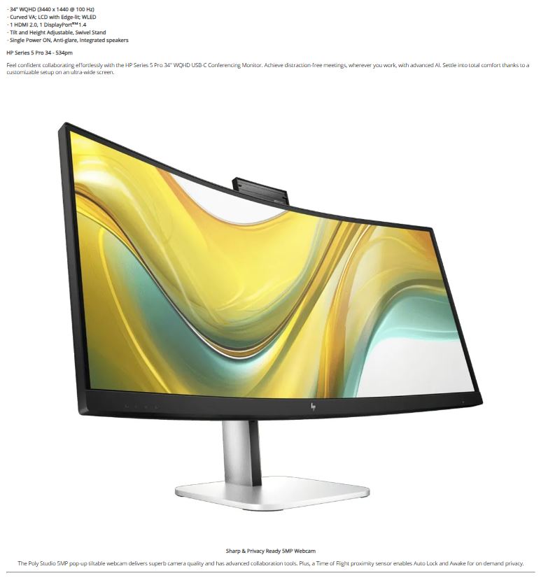 HP Series 5 Pro 34′ WQHD 4K CURVED 21:9 3440×1440 100Hz Height Adjust VA LCD Tilt Swivel USB-C DP HDMI Speakers VESA Webcam 3yrs wty